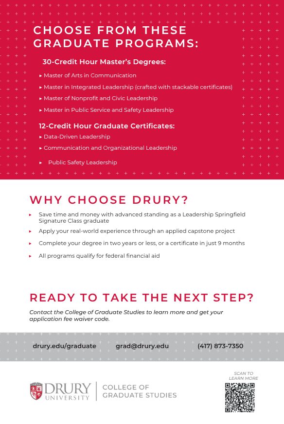 This offer is retroactive to Class 29, which graduated in 2014. There is no tuition cost and no GRE required for admission. Drury will waive the $25 application fee for all Leadership Springfield applicants. For more information and the fee waiver code, contact the College of Graduate Studies at (417) 873-7530 or [email protected]