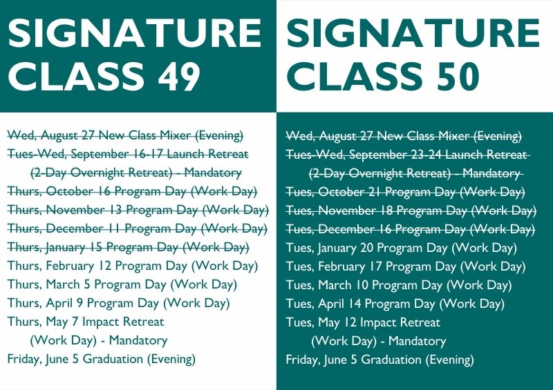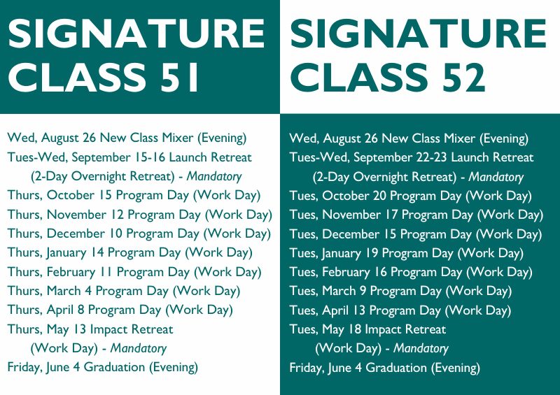 In order to accommodate a greater pool of applicants, we offer two Signature Classes that run simultaneously but on different days each month.